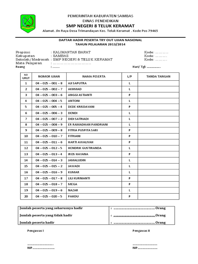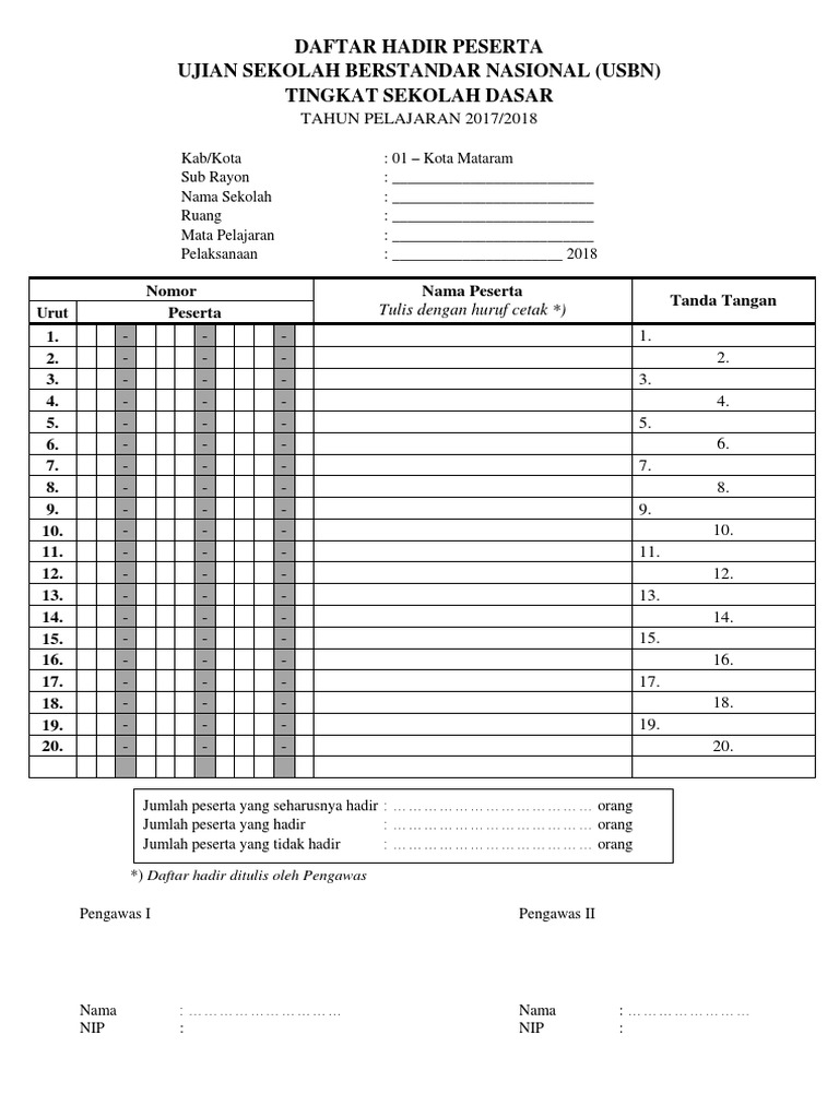 Daftar Hadir Untuk Peserta Ujian merupakan bagian hal penting yang harus dipersiapkan dimana daftar tersebut digunakan untuk memantau kehadiran peserta pelaksana Ujian juga sebagai pelaporan data. Academiaedu is a platform for academics to share research papers. Daftar Hadir Pengawas Ujian Nasional ini meliputi beberapa bagian diantaranya adalah Nama Pengawas Ujian Nasional beserta NIP Asal Sekolah Pengawas Ujian Nasional dan bukti tanda tangan sebagai presensi kehadiran pengawas untuk lebih jelasnya anda bisa simak tampilan dari Daftar Hadir Pengawas Ujian Nasional di bawah ini.